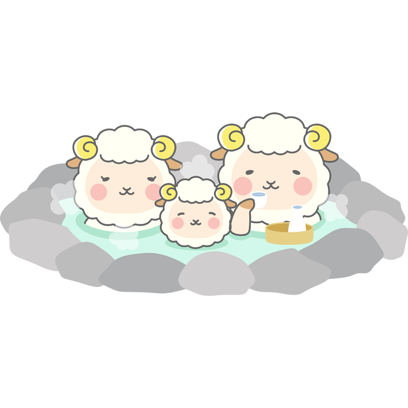 露天風呂(温泉)に浸かっている、かわいい羊(未)の家族のイラスト素材です。